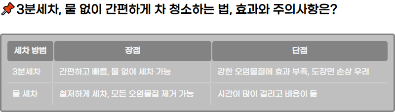 3๋ถ์ธ์ฐจ ์ ํ์ ์ฐจ๋์ ๋ฌป์ ๊ฐํ ์ค์ผ๋ฌผ์ง์ ๋ํด์๋ ํจ๊ณผ๊ฐ ์ ํ์ ์ผ ์ ์์ต๋๋ค. ์๋ฅผ ๋ค์ด, ์งํ์ด๋ ์ฅ๊ธฐ๊ฐ ๋ง๋ผ๋ถ์ ์ค์ผ๋ฌผ์ด ์ฐจ๋์ ์์ ๊ฒฝ์ฐ ์ด ์ ํ๋ง์ผ๋ก๋ ์ถฉ๋ถํ ๊นจ๋ํ๊ฒ ์ธ์ฐจํ๊ธฐ ์ด๋ ค์ธ ์ ์์ต๋๋ค. ์ด๋ฌํ ๊ฒฝ์ฐ์๋ ์ ํต์ ์ธ ๋ฌผ ์ธ์ฐจ ๋ฐฉ๋ฒ์ ์ฌ์ฉํ๋ ๊ฒ์ด ์ข์ต๋๋ค. ๋ํ, ๊ฐํ ์ค์ผ๋ฌผ์ง์ด ๋จ์์๋ค๋ฉด ์ธ์ฐจ ํ์๋ ํ๋ฉด์ด ๊นจ๋ํ์ง ์์ ์ ์์ต๋๋ค.