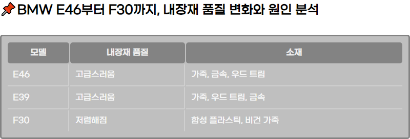 BMW๋ 1990๋ ๋์ 2000๋ ๋ ์ด๋ฐ, E46(3์๋ฆฌ์ฆ) ๋ฐ E39(5์๋ฆฌ์ฆ) ๋ชจ๋ธ์ ํตํด ๊ณ ๊ธ์ค๋ฌ์ด ๋ด์ฅ์ฌ๋ก ๋ง์ ์ฌ๋์ ๋ฐ์์ต๋๋ค. ๊ทธ ๋น์ BMW๋ ๋ด์ฅ์ฌ ํ์ง์ ์๋ํ๋ฉฐ, ์ฐจ๋์ ๋ด๋ถ๋ฅผ ๊ณ ๊ธ์ค๋ฝ๊ณ ๊ฒฌ๊ณ ํ๊ฒ ์ค๊ณํ์ต๋๋ค. ๋น์์ BMW ์ฐจ๋๋ค์ ๊ณ ๊ธ์ค๋ฌ์ด ๊ฐ์ฃฝ, ์ฐ๋ ํธ๋ฆผ, ๊ทธ๋ฆฌ๊ณ ๊ธ์ ์ฌ์ง์ ๋ํ ์ผ์ด ์ ๋ฐ์๋์ด ์์ด ๋ง์ ํฌ๋ค์ ์ฐฌ์ฌ๋ฅผ ๋ฐ์๊ณ , BMW๋ฅผ ํ๋ ๊ฒ์ ๊ทธ ์์ฒด๋ก ๊ณ ๊ธ์ค๋ฌ์์ ์์ง์ผ๋ก ์ฌ๊ฒจ์ก์ต๋๋ค.