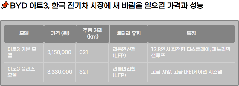 2025๋ , ์ค๊ตญ ์ ๊ธฐ์ฐจ ์ ์กฐ์ฌ์ธ BYD๊ฐ ํ๊ตญ ์์ฅ์ ์ํ 3๋ฅผ ๊ณต์ ์ถ์ํ๋ฉฐ ์ ๊ธฐ์ฐจ ์์ฅ์ ์๋ก์ด ๋ณํ์ ๋ฐ๋์ ๋ถ์ด๋ฃ๊ณ ์์ต๋๋ค. ์ํ 3๋ ๊ธ๋ก๋ฒ ์์ฅ์์ ๋ฐ์ด๋ ์ธ๊ธฐ๋ฅผ ๋๊ณ ์์ผ๋ฉฐ, ํ๊ตญ ์์ฅ์์๋ ๊ทธ ์ธ๊ธฐ๋ฅผ ์ด์ด๊ฐ ๊ฒ์ผ๋ก ์์๋ฉ๋๋ค.