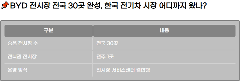 BYD ์ „์‹œ์žฅ ์ „๊ตญ 30๊ณณ ์™„์„ฑ, ํ•œ๊ตญ ์ „๊ธฐ์ฐจ ์‹œ์žฅ ์–ด๋””๊นŒ์ง€ ์™”๋‚˜?