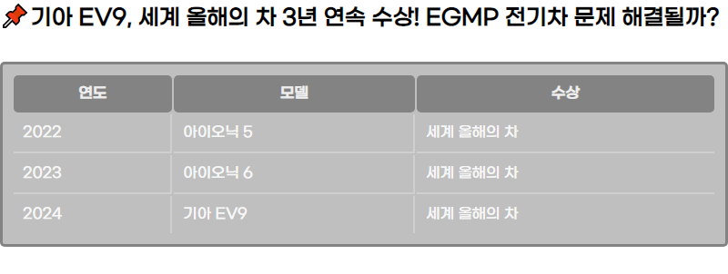 ๊ธฐ์ EV9๋ ํ๋์๋์ฐจ๊ทธ๋ฃน์ ์ ๊ธฐ์ฐจ ํ๋ซํผ์ธ EGMP๋ฅผ ๊ธฐ๋ฐ์ผ๋ก ์ ์๋์ด ์ธ๊ณ์ ์ผ๋ก ์ธ์ ๋ฐ์ ์ ๊ธฐ์ฐจ ๋ชจ๋ธ์ ๋๋ค. EGMP๋ฅผ ๊ธฐ๋ฐ ์ฐจ๊ฐ 2022๋ ๋ถํฐ 2024๋ ๊น์ง 3๋ ์ฐ์ ์ธ๊ณ ์ฌํด์ ์ฐจ๋ก ์ ์ ๋์์ต๋๋ค. ์ด๋ ๊ธฐ์์ ํ๋์ฐจ์ ์ ๊ธฐ์ฐจ ๊ธฐ์ ๋ ฅ์ด ๋๋๋๋ก ์ฐ์ํ๋ค๋ ๊ฒ์ ์ ์ฆํ๋ ์ฌ๋ก๋ก, ์ ์ธ๊ณ ์๋์ฐจ ์ฐ์ ์์ ํฐ ์ด์๊ฐ ๋์์ต๋๋ค.