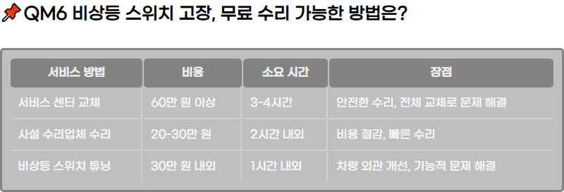 QM6 ์ฐจ๋์์ ๋ฐ์ํ๋ ๋น์๋ฑ ์ค์์น ๊ณ ์ฅ ๋ฌธ์ ๋ฅผ ํด๊ฒฐํ ์ ์๋ ๋ฌด๋ฃ ์๋ฆฌ ๋ฐฉ๋ฒ์ ์์๋ณด์ธ์. ์๋น์ค ์ผํฐ์์ ๊ณ ์ง์ ์ธ ๋ฌธ์ ๋ก ๊ต์ฒด๋ฅผ ๊ถ์ ํ์ง๋ง, ๋ณด์ฆ๊ธฐ๊ฐ ๋ด์๋ ๋ฌด์์ผ๋ก ์๋ฆฌ๊ฐ ๊ฐ๋ฅํ๋ฉฐ, ๋ณด์ฆ์ด ์ง๋ ๊ฒฝ์ฐ์๋ ๋ค์ํ ํด๊ฒฐ ๋ฐฉ๋ฒ์ด ์กด์ฌํฉ๋๋ค. ๋ํ, ์ฌ์ค ์๋ฆฌ์ ์ฒด๋ ํ๋ ์ต์ ๋ ์๊ฐ๋ฉ๋๋ค.