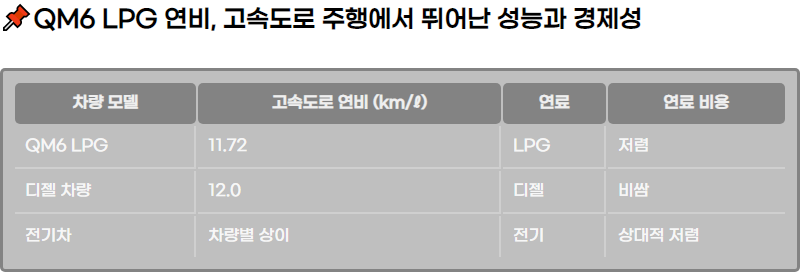 QM6 LPG๋ ๊ณ ์๋๋ก์์ ์ฐ์ํ ์ฐ๋น๋ฅผ ๋ณด์ฌ์ฃผ๋ ์ฐจ๋์ผ๋ก, 2022๋ ๊ณผ 2023๋ ์์น์์ ๋ชจ๋ ๋ฐ์ด๋ ์ฐ๋น ๊ฒฐ๊ณผ๋ฅผ ๊ธฐ๋กํ์ต๋๋ค. ์ค์ ์ฃผํ์์ ๋ํ๋ ์ฐ๋น๋ ๊ณต์ธ ์ฐ๋น๋ณด๋ค ๋๊ฒ ๋ํ๋ฌ์ผ๋ฉฐ, ์ด๋ ๊ณ ์๋๋ก ์ฃผํ์์ ๋์ฑ ๋๋ณด์ด๋ ํน์ง์ ๋๋ค. ์๋ฅผ ๋ค์ด, 2022๋ ์์น์์ QM6 LPe ๋ชจ๋ธ์ ๊ณ ์๋๋ก์์ 11.09km/โ์ ์ค์ฐ๋น๋ฅผ ๊ธฐ๋กํ์ผ๋ฉฐ, ์ด๋ ๊ณต์ธ ๊ณ ์๋๋ก ์ฐ๋น 10.1km/โ๋ณด๋ค ์ฝ 10% ๋์ ์์น์ ๋๋ค.