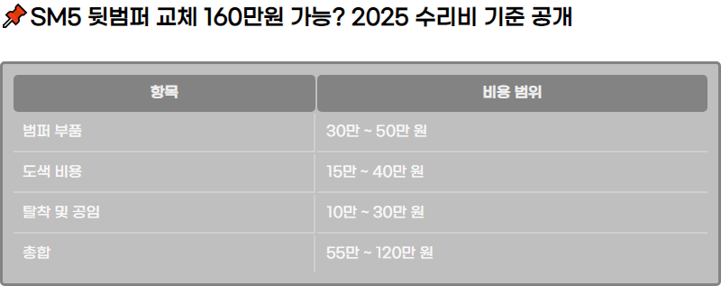 SM5 ์ฌ๊ณ ํ ๋ท๋ฒํผ ๊ต์ฒด ๊ฒฌ์ ์ด 160๋ง ์๊น์ง ๋์ฌ ์ ์์๊น? 2025๋ ๊ธฐ์ค ๊ตญ๋ด ์๋์ฐจ ์๋ฆฌ๋น ๊ตฌ์กฐ๋ฅผ ๋ฐํ์ผ๋ก ๋ฒํผ ๋ถํ๋น, ๋์๋น, ๊ณต์๋น, ๊ณต์ ์๋น์ค์ผํฐ์ ์ผ๋ฐ ๊ณต์ ์ฌ์ ๋น์ฉ ์ฐจ์ด, ํ๋ฐฉ ์ผ์ ์ ๋ฌด์ ๋ฐ๋ฅธ ์ถ๊ฐ ๋น์ฉ๊น์ง ๊ฐ๊ด์ ์ผ๋ก ์ ๋ฆฌํ๋ค. ๋ณดํ ์๋ฆฌ ์ ๋น์ฉ์ด ๋์์ง๋ ์ด์ ์ ํ๊ท ๊ฒฌ์ ๋ฒ์๋ ํจ๊ป ํ์ธํ ์ ์๋ค.